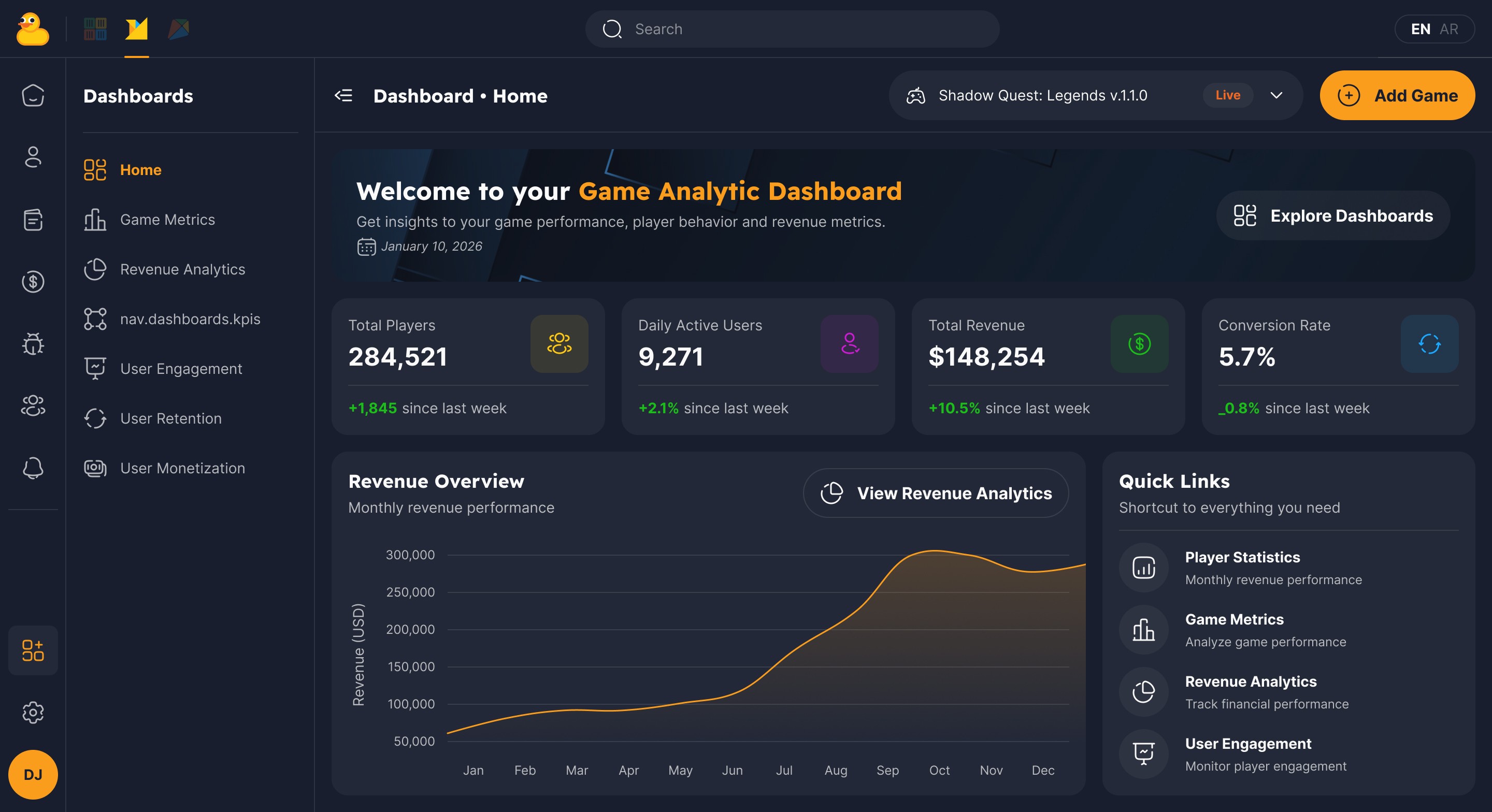 Understand how your game is doing in term of retention, session times, and heatmaps.